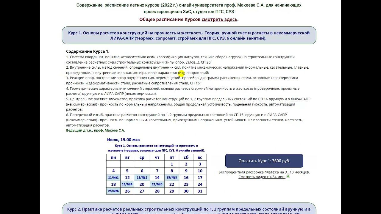 Ссылка на сайт курса https://makeev.justclick.ru/02leto2022. Скачать бесплатно некоммерческую ЛИРА-САПР 2016 https://rflira.ru/kb/93/452/. Краткое содержание Курса: 1. Система координат, понятие «относительно оси», классификация нагрузок, техника сбора нагрузок на строительные конструкции, составление расчетных схем строительных конструкций (типы опор, узлов…), СП 20.13330.2017 "Нагрузки и воздействия"; 2. Внутренние силы, метод сечений, определение внутренних сил, понятие механических напряжений (нормальные, касательные, главные, приведенные…), внутренние силы как интегральные характеристики напряжений; 3. Реакции опор, построение эпюр внутренних сил, перемещений, прогибов, диаграмма растяжения стали, основные характеристики прочности и деформативности стали, расчетные сопротивления стали, СП 16.13330.2017 "Стальные конструкции"; 4. Геометрические характеристики сечений стержней, основы расчетов стержней на прочность и жесткость (проверочные, проектные расчеты) вручную и в ЛИРА-САПР (некоммерческая); 5. Центральное растяжение-сжатие, практика расчетов конструкций по 1, 2 группам предельных состояний по СП 16 вручную и в ЛИРА-САПР (некоммерческая) - прочность по нормальным напряжениям, общая продольная устойчивость, предельная гибкость, автоматизация расчетов; 6. Поперечный изгиб, практика расчетов конструкций по 1, 2 группам предельных состояний по СП 16, вручную и в ЛИРА-САПР (некоммерческая) - прочность по нормальным, касательным, приведенным напряжениям, устойчивость из плоскости стенки, жесткость, автоматизация расчетов. Ведущий д.т.н., проф. Макеев С.А. Сайт онлайн университета https://sopromex.ru/. Ссылка на подписную страницу моих бесплатных видео материалов по основам расчетов конструкций на прочность и жесткость (это 20 ГБ информации) https://makeev.justclick.ru/podpiska_2020 или на главной сайта онлайн университета.