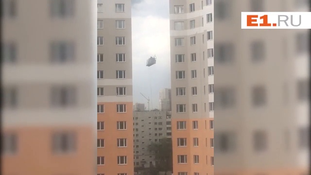 Ураган бьет строителей в люльке об стену дома