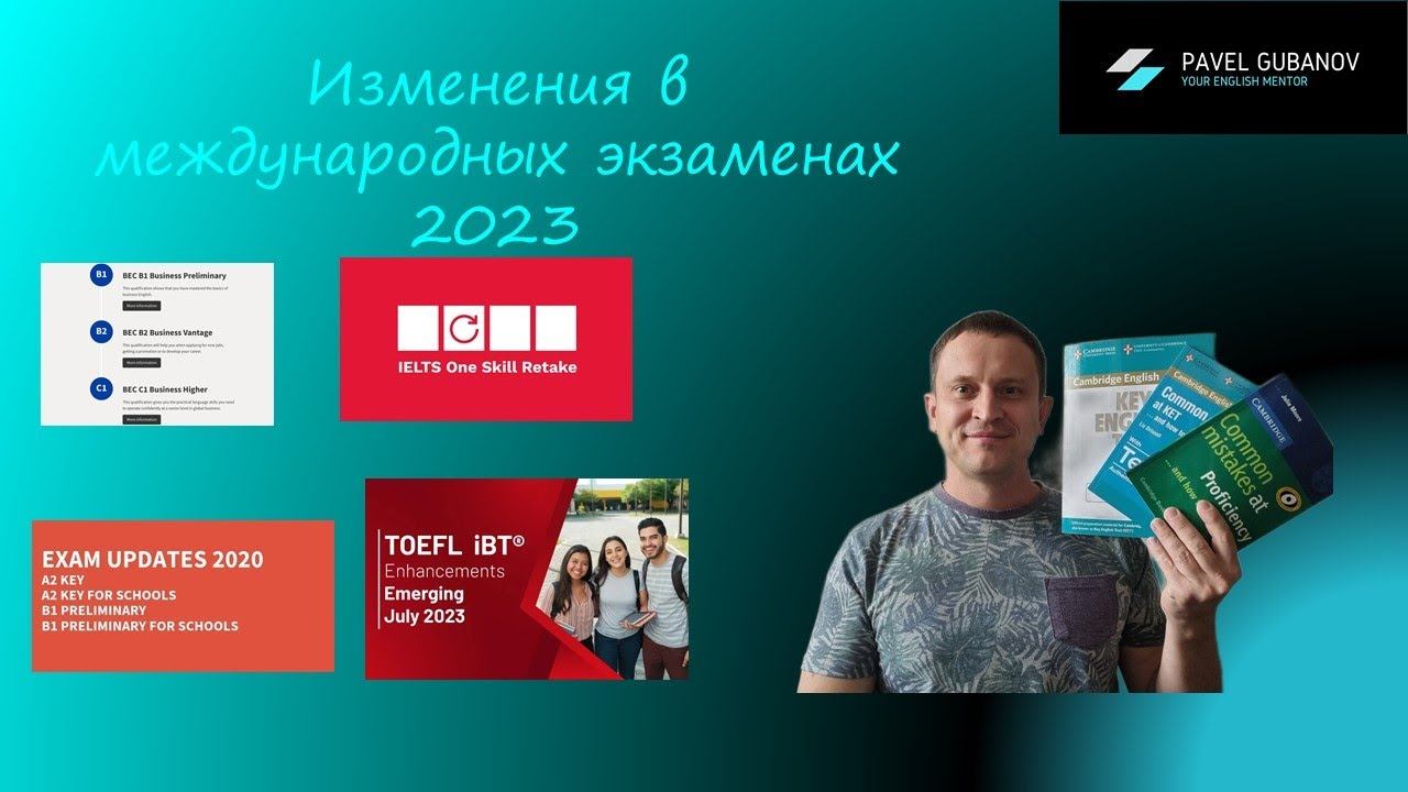 Краткое изложение: В этом видео я рассказываю про изменения в линейке кембриджских экзаменов IELTS, PET, KET, FCE, CAE, о прекращении приёма экзаменов по бизнес английскому B1 Business Preliminary, B2 Business Vantage и C1 Business Higher и новом формате TOEFL, который можно сдавать в России в онлайн формате. Enjoy! Instagram: https://www.instagram.com/ceo_english ✈️ Telegram: https://t.me/pavelgubanovceo Группа ВК: https://vk.com/ceoenglish ☎️ Мой номер: +7-925-995-87-25 Почта для связи: info@ceoenglish.ru Полезные плейлисты: Грамматика — https://goo.su/QqD1G Обзоры книг — https://goo.su/g0Wu Стратегия обучения — https://goo.su/mJ7TYb Этот канал создан для того, чтобы делиться знаниями в сфере изучения английского языка по нескольким направлениям: 1) Общие принципы и методики обучения английскому языку (грамматика, лексика, говорение, письмо, аудирование) 2) Обзоры интересных книг про образование, бизнес, биографии выдающихся людей и, конечно, просто интересные книги из самых разных жанров 3) Обзор учебных пособий 4) Разбор песен и газетных статей 5) Интервью с людьми из образовательной, переводческой и бизнес среды #ПавелГубанов #Английский #ОбучениеАнглийскому #БизнесАнглийский #ДеловойАнглийский #кембриджскиеэкзамены #ielts #toefl