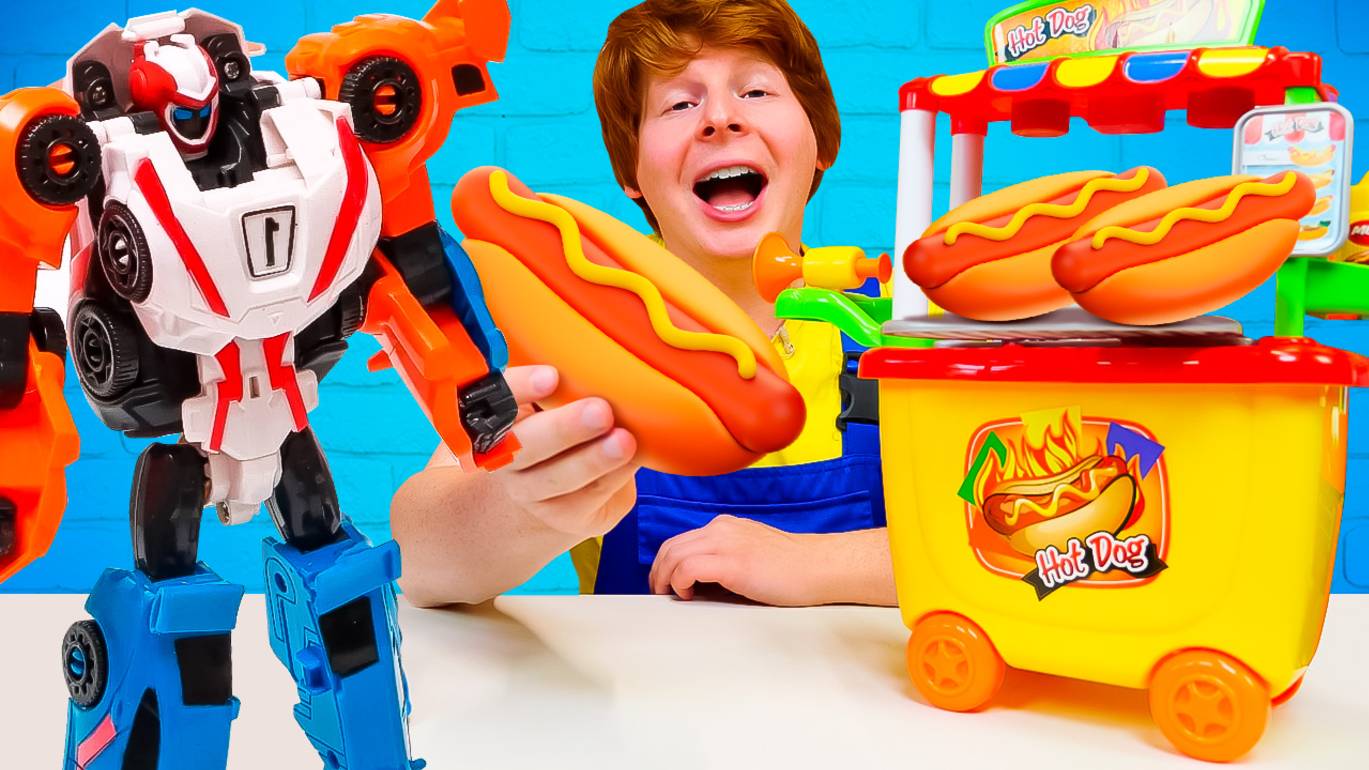 Робот торговал хот-догами во время гонки и сломал тележку! Видео про машинки для мальчиков