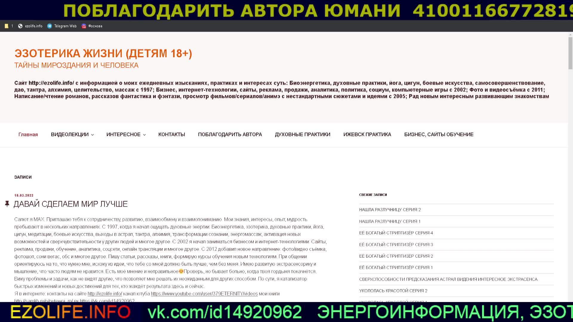 СЛАВЯН НА ПЛАНЕТЕ СТАНОВИТСЯ ВСЕ МЕНЬШЕ ВЕСНА 2022 ПРОГНОЗЫ РЕШЕНИЯ МОЙ КАНАЛ https://www.youtube.com/user/379ETERNITY/videos ДУХОВНЫЕ ПРАКТИКИ БИЗНЕС СВЕРХСПОСОБНОСТИ МОЯ ФАНТАСТИКА http://samlib.ru/p/putewoj_m/ МОЙ САЙТ http://ezolife.info/ RUTUBE https://rutube.ru/channel/23989944/