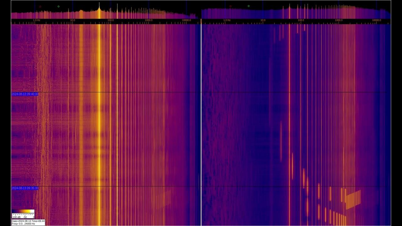 Левый и правый сигналы снимаются с индуктивных датчиков с ферромагнитными элементами, но левый соеденён дополнительно с заземлением на 2-х штырях из нержавеющей стали заглублённых на 1м и отстоящих друг от друга на 1м. Можно видеть большое количество гармоник от электросети и различные искуственные сигналы. Интерес представляют сигналы на частотах ниже 50Гц, где можно наблюдать работу специализированной аппаратуры и сигналы связи подводных лодок и подъземных объектов. Отдельно стоит рассматривать сигналы в районе 1-3Гц на левом спектре, которые относятся к геомагнитному фону, который модулируется солнечной активностью, более детально их можно рассмотреть в видео под названием "Сигналы из Земли", которые есть в плэйлистах ниже. О ПРОИСХОЖДЕНИИ ЧАСТОТНОЙ МОДУЛЯЦИИ СЕРПЕНТИННОЙ ЭМИССИИ https://youtu.be/bwWHggY1IVU?si=xAX1diRKI9MxQJ88&t=1740 Previous monitoring is in playlists: EMF monitor https://youtube.com/playlist?list=PLiRg2YCbXcwn41BHqADKVBep_TgVq6XUN Очень Низкая Частота ~ Very Low Frequency https://youtube.com/playlist?list=PLiRg2YCbXcwnp5DxM4PnSs7k_Rnypaqek SIGNALS IN THE GROUND https://youtube.com/playlist?list=PLiRg2YCbXcwl6f3Bf5arHbGSOCNE5U71O поддержать канал: 8-999-654-93-44