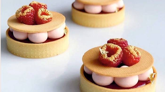 Песочное сабле: 240 г муки 1,5 г соли 40 г миндальной муки 85 г сахарной пудры 52 г яйца 115 г сливочного масла Приготовление: @ Муку смешать с солью. Добавить холодное сливочное масло и превратить в крошку. Добавить миндальную муку и сахарную пудру. @ Добавить яйца. Замесить тесто и раскатать толщиной 2-2,5 мл между двумя листами пергамента. Стабилизировать в холодильнике 4 часа. @ Сформировать тарты. Снова стабилизировать. Перед выпечкой подморозить. Выпекать при 165-170 около 15 минут. Хрустящий слой: 90 г белого шоколада 20 гкукурузного масла 60 г карамелизированной вафли (роялтин) 30 г сублимированной малины Приготовление: @ Шоколад растопить. Добавить масло и вафлю. Тонким слоем распределить по тартам. @ Стабилизировать 30 минут. Конфи малина: 240 гпюре малины 45 г сахара 4 гпектина МН 2 г лимонной КИСЛОТЫ Приготовление: Пюре поставить на огонь. Подогреть до 35-40С. Всыпать сахар, смешанный с пектином. Прокипятить 30 секунд. Добавить лимонную кислоту. Немного остудить и вылить поверх хрустилайна и убрать в морозилку до заполнения муссом. Легкий мусс 125 г сливок 33%(1) 125 г белого шоколада Калебо 5 гжелатина 220 бл 270 г сливок 33%(2} Приготовление: Сливки(1) и желатиновую массу довести до кипения и вылить на шоколад. Сделать эмульсию с помощью блендера. Остудить до 29С. Объединить с полувзбитыми сливками (2). Добавить сублимированную ягоду. Распределить по тартам Стабилизировать в холодильнике 4 часа. Малиновый ганаш 240 г сливок 33% 85 г белого шоколада Калебо 80 г клубничного шоколада Калебо 2 гжелатина 35 г пюре малины Приготовление: Половину сливок, пюре и желатиновую массу довести до кипения. Вылить на шоколад. Слелать эмульсию с помощью блендера. Влить оставшиеся холодные сливки и пюре. Снова сделать эмульсию. Накрыть пленкой в контакт. Стабилизировать в холодильнике минимум 12 часов. Взбить. С помощью круглой насадки украсить тарты.