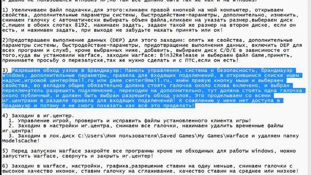 Собрал все способы в один ролик! "6 действий 1 Решение" "КРАШ КЛИЕНТА" Я давно не пользовался Windows XP,но там всё должно быть так же как и на Windows7 1) Увеличиваем файл подкачки,для этого:кликаем правой кнопкой на мой компьютер, открываем свойства, дополнительные параметры системы, быстродействие-параметры, дополнительно, изменить, снимаем галочку с Автоматически выбирать объем файла,кликаем на указать размер,выбераем диск С,пишем в обоих слотах 8192, нажимаем задать, задаем такой же размер на втором диске, если он есть, и нажимаем задать, при выходе не забудьте нажать принять или ок! 2)Предотврашаем выполнение данных (DEP) для этого заходим: опять же свойства, дополнительные параметры системы, быстродействие-параметры, придотвращение выполнения данных, включить DEP для всех программ и служб, кроме выбранных ниже, добавить, выбираем диск С/D/E в зависимосте от того,куда вы установили Warface, заходим Warface: Bin32Release и выбераем файл Game,принять, принимаете просьбу о перезапуске,так же нужно сделать и с ПТС,если он есть! 3) Разрешаем обход узлов в Брандмауэр: Панель управления, система и безопасность, брандмауэр Windows, дополнительные параметры, правела для входящих подключений, в открившимся списке ищем надпис,игровой центер@mail.ru или game center@mail.ru, жмём правую кнопку мыши и выбераем свойства, во вкладке общие обязательно должна стоять галочка около слова включено, и выбран переключатель разрешить подключение, переходим на дополнительно, тут должна стоять одна галочка около публичный, и должен быть выбран разрешить обход узлов, Это проделываем со всеми иг.центрами в разделе правела для входящих подключений! К сожелению у меня нет доступа в брадмауэр и потому я не смогу показать как всё это проделать! 4) Заходим в иг.центер. 1. Управление игрой, проверить и исправить файлы установленного клиента игры! 2. Заходим в настройки иг.центра, снимаем все галочки, нажимаем удалить временные файлы иг.центра! 3. Заходим в лок.диск C:\Users\Имя пользователя\Saved Games\My Games\Warface и удаляем папку ModelsCache! 5) Перед запуском Warface закройте все программы кроме не обходимых для работы Windows, можно запустить Warface, свернуть и закрыть иг.центер! 6) Заходим в Warface, настройки, графика,разрешение ставим на одиу меньше, снимаем галочки с высокое качество иконок, ставим галочку на сглаживание, качество ставим на среднее или низкое! После всего этого просто перегрузитесь! Покрайней мере у меня так получилось!!!
