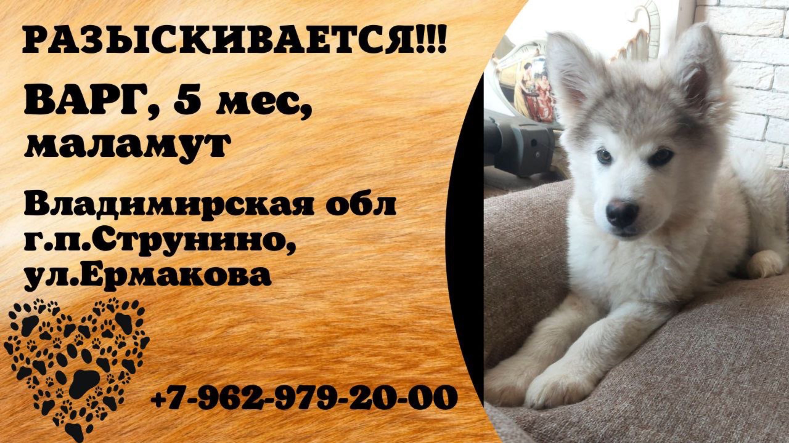 Пропала собака! ВАРГ, 5 мес, маламут. Владимирская обл., г.п.Струнино.