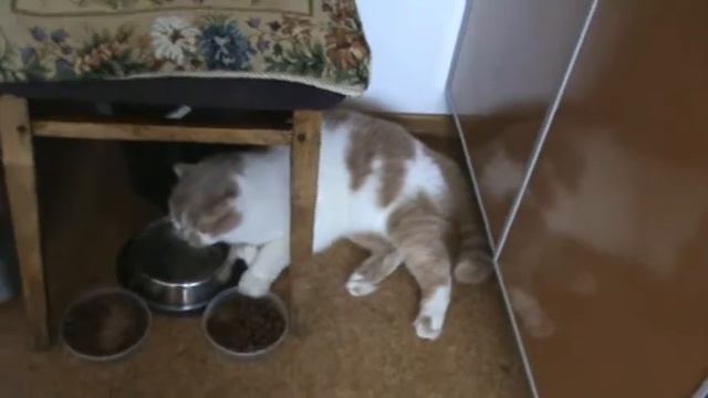 Кот пьет лежа