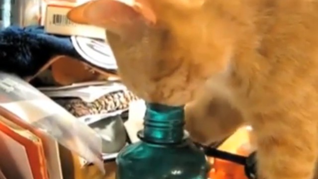 Кошка пытается влезть в бутылку?!