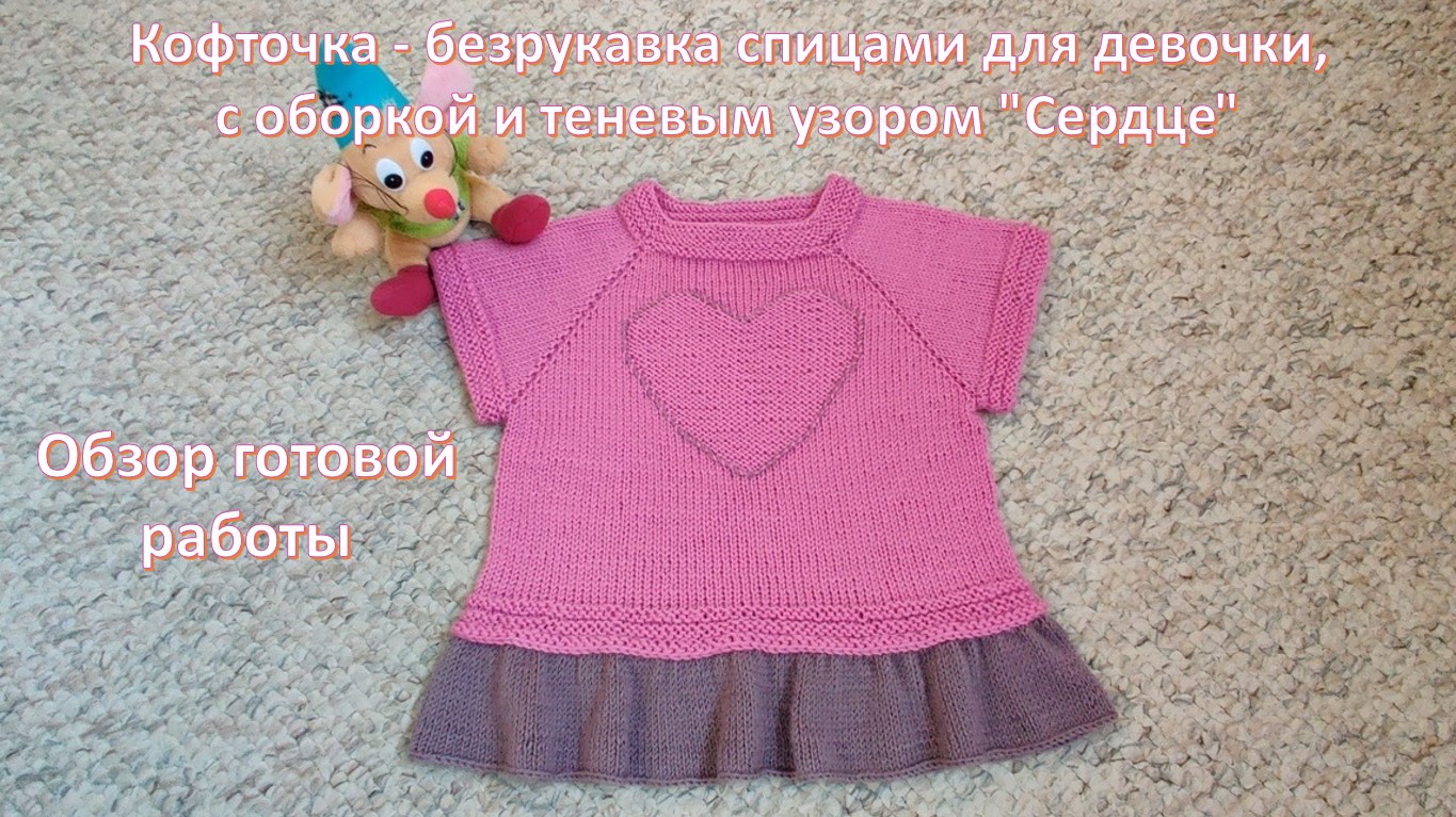 Кофточка - безрукавка спицами для девочки, с оборкой и теневым узором "Сердце". Обзор готовой работы
