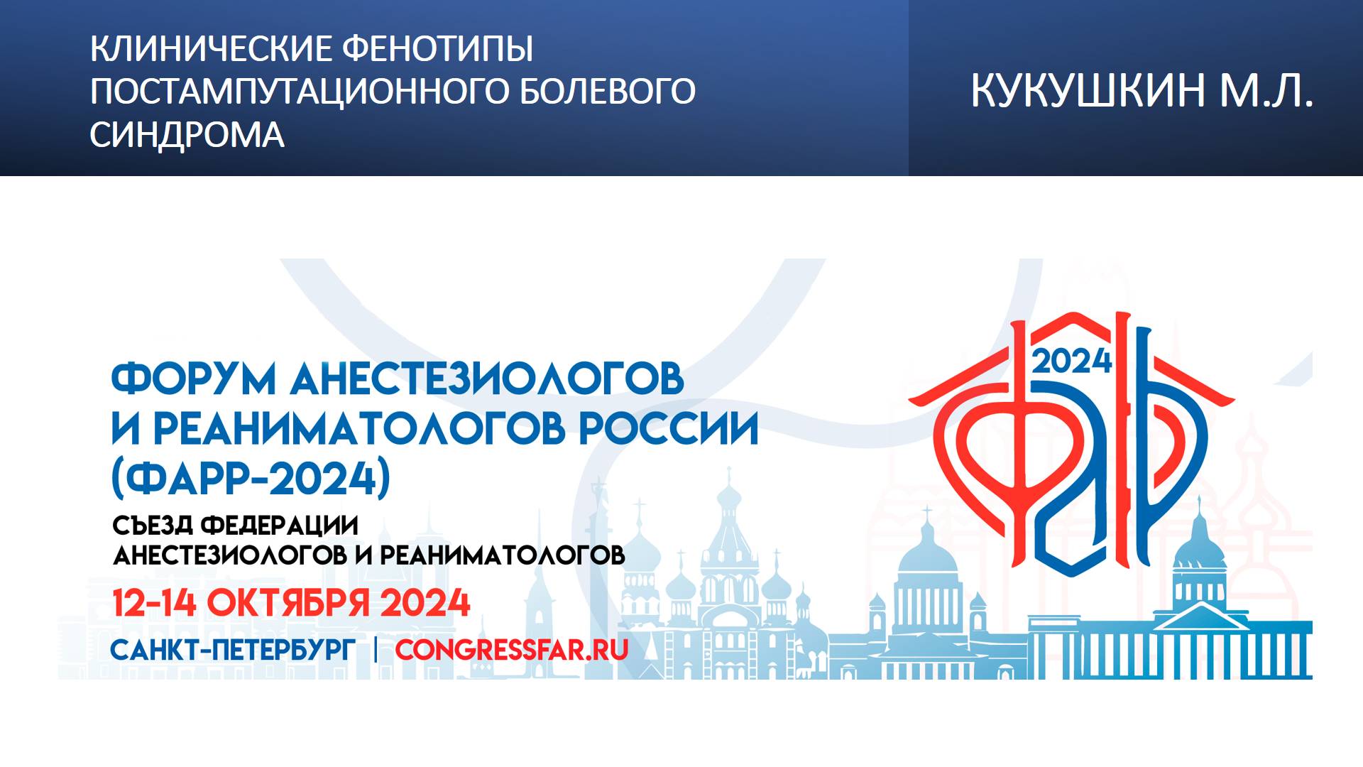Видеозапись ФАРР-2024, XXII съезд Федерации анестезиологов и реаниматологов 12-14 октября 2024, Санкт-Петербург. Михаил Львович Кукушкин "Клинические фенотипы постампутационного болевого синдрома" Информация, размещенная на канале, предназначена исключительно для медицинских специалистов