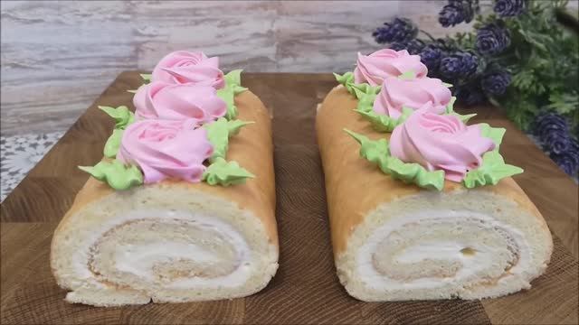 Японский бисквитный рулет со сметанным кремом. Украшение белково заварным кремом