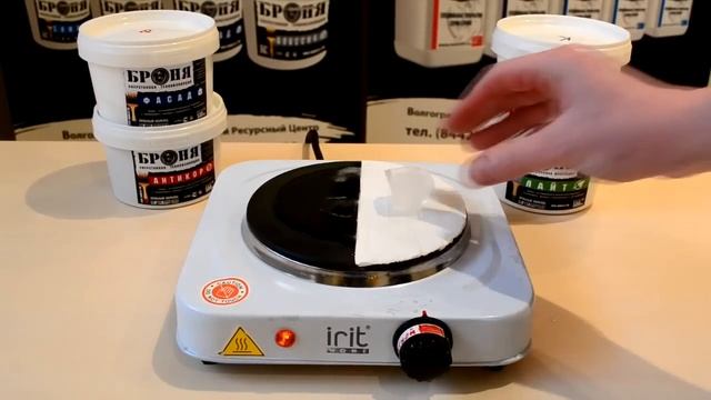 В данном эксперименте со льдом представлена обычная нагревательная плита, одна часть которой покрыта жидким керамическим теплоизоляционным материалом Броня. После нагрева плиты, на обе её части кладутся куски льда. Как видно,1 слой теплоизоляции Броня создает надежный тепловой барьер, для того чтобы не дать льду растаить.