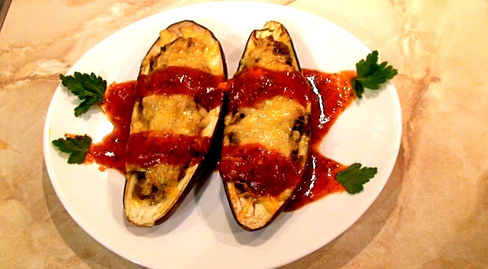 Думаете, как приготовить баклажаны, чтобы не стоять долго у плиты? Попробуйте сделать ужин на скорую руку по моему рецепту. Фаршированные баклажаны в духовке можно приготовить минут за 30. Точнее, столько займет подготовка, ну и еще около 40 минут лодочки из баклажанов с начинкой из мяса проведут в духовке. Чтобы сделать фаршированные баклажаны, вам потребуются такие продукты: • 3 баклажана; • 1 луковица; • 100 грамм сыра; • 400 грамм мясного фарша • соль, перец, гранулированный чеснок и сушеный базилик по вкусу; • 100 грамм томатной пасты; • пучок укропа и петрушки; • стебель сельдерея. Другие подробности, как сделать баклажаны с фаршем в духовке, смотрите в рецепте. Приятного всем аппетита!