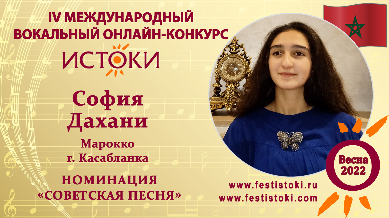 Лауреат III степени IV Международного вокального онлайн-конкурса «Истоки».Весна-2022. Номинация "Советская песня". Песня "Московские окна". Музыка Тихона Хренникова, стихи Михаила Матусовского. Сайт: www.festistoki.ru / www.festistoki.com E-mail: festistoki@mail.ru
