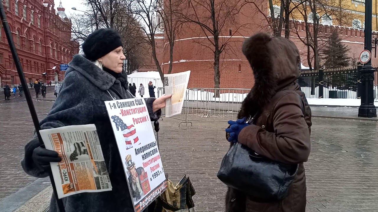 Москва. Пост № 1. Манежная Площадь. Одиночный информационный пикет участника Национально-Освободительного Движения (НОД). Ежедневно пикетчики Национально-Освободительного Движения рассказывают соотечественникам о правовой диверсии в нашей конституции о внешнем управлении государством и о начале сбора решений (подписей) граждан с 1 марта за проведение всенародного референдума по изменению статей 9.2 ; 13.2 и 15.4 нашей конституции, что позволит вернуть нам суверенитет России, утерянный в 1991-93 гг.