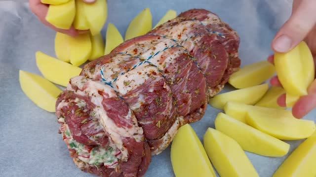 Здравствуйте, уважаемые подписчики и гости моего канала! Этот рулет очень вкусный! Если предпочитаете такой рулет холодным, то не снимайте нитки до полного застывания мяса. Получается невероятно нежное и очень сочное мясо! ✅Ингредиенты: ~ 1 кг свинины; 2 ч.л. соли, 1 ч.л. черного перца, 1 ч.л. хлопьев чили, 2 ч.л.сушенного базилика; 1 сладкий перец; пучок петрушки; 150 г мягкого плавленного сыра; 3-4 картофелины; картофель взбрызгните оливковым маслом и посолите; по желанию, можно посыпать паприкой; Спасибо за просмотр, комментарий и подписку! Приятного аппетита! Спасибо что, смотрите👀 мои видео! Если Вам не сложно, подпишитесь🔊 на мой канал. Если Вам понравилось видео, поставьте 👍 💘,сделайте репост;) Буду рад любому донату💲 на корм моему котику Василию 🐱😇🌹 Вам мелочь, а нам приятно.🌹