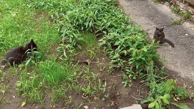 Возле дома гуляют котики, немного и пошли домой.