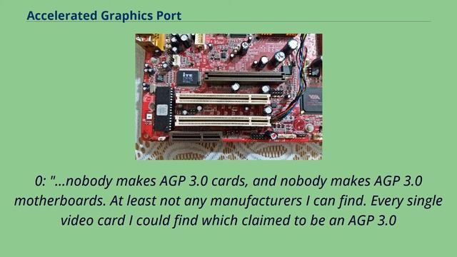 Accelerated Graphics Port, by Wikipedia https://en.wikipedia.org/wiki?curid=2380 / CC BY SA 3.0 #Macintosh_internals #IBM_PC_compatibles #Intel_graphics #Motherboard_expansion_slot #Peripheral_Component_Interconnect Accelerated Graphics Port (AGP) is a parallel expansion card standard, designed for attaching a video card to a computer system to assist in the acceleration of 3D computer graphics. It was originally designed as a successor to PCI-type connections for video cards. Since 2004, AGP has been progressively phased out in favor of PCI Express (PCIe), which is serial, as opposed to parallel; by mid-2008, PCI Express cards dominated the market and only a few AGP models were available, with GPU manufacturers and add-in board partners eventually dropping support for the interface in favor of PCI Express. As computers increasingly became graphically oriented, successive generations of graphics adapters began to push the limits of PCI, a bus with shared bandwidth. This led to the development of AGP, a "bus" dedicated to graphics adapters. AGP is heavily based on PCI, and in fact the AGP bus is a superset of the conventional PCI bus, and AGP cards must act as PCI cards. The primary advantage of AGP over PCI is that it provides a dedicated pathway between the slot(s) and the processor rather than sharing the PCI bus. In addition to a lack of contention for the bus, the direct connection allows for higher clock speeds. The second major change is that AGP uses split transactions, where the address and data phases of a PCI transaction are separated. The card may send many address phases, and the host processes them in order. This avoids long delays, with the bus idle, during read operations. Third, PCI bus handshaking is simplified. Unlike PCI bus transactions whose length is negotiated on a cycle-by-cycle basis using the FRAME# and STOP# signals, AGP transfers are always a multiple of 8 bytes long, and the total length is included in the request. Further, rather than ...
