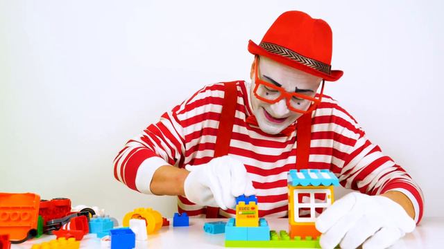 Смешное видео для детей про конструктор. Клоун Гоша кормит машинки и строит Заправочную Станцию!