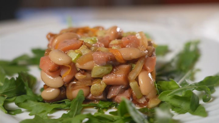 Простая кухня | Салат «Праздничный» ---------------------------------------------------------------------------- Рецепт: · Фасоль консервированная - 150 г · Морковь - 1 шт. · Кабачок- 100 г · Рыба копчёная- 1 шт. · Листья салата /руккола - по желанию Заправка: · Соевый соус - 1 ст. л. · Лук белый - 1/2 шт. · Масло растительное - 3 ст. л. (+1 ст.л. для жарки) · Соль, молотый и красный жгучий перец - по вкусу