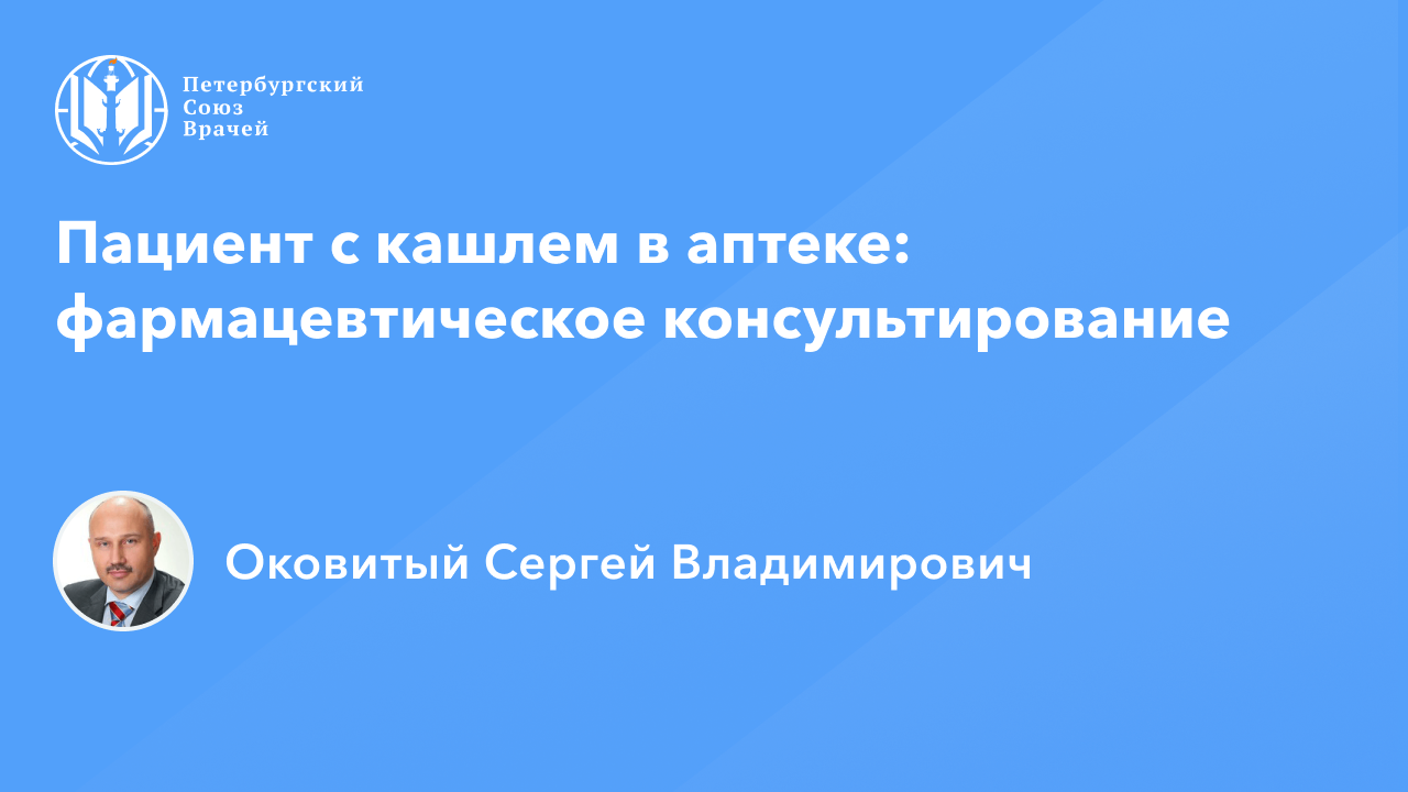 Сайт: spb.doctor Видеозапись онлайн-семинара «Пациент с кашлем в аптеке: фармацевтическое консультирование» Дата проведения: 17.03.2023, 20:00 Страница мероприятия: https://www.spb.doctor/info/23031720/ Программа: 1. Пациент с кашлем в аптеке: фармацевтическое консультирование. Оковитый Сергей Владимирович 2. Мукоактивные препараты в лечении кашля. Оковитый Сергей Владимирович 3. Ответы на вопросы О семинаре: Кашель — одна из самых частых жалоб, с которой посетители аптек обращаются за консультацией к фармспециалисту. В онлайн-семинаре будут представлены алгоритмы фармацевтического консультирования посетителей аптек при кашле, будут рассмотрены ключевые фармакокинетические и фармакодинамические особенности препаратов данной группы, представлен ассортимент лекарственных средств, разрешенных к отпуску без рецепта врача.
