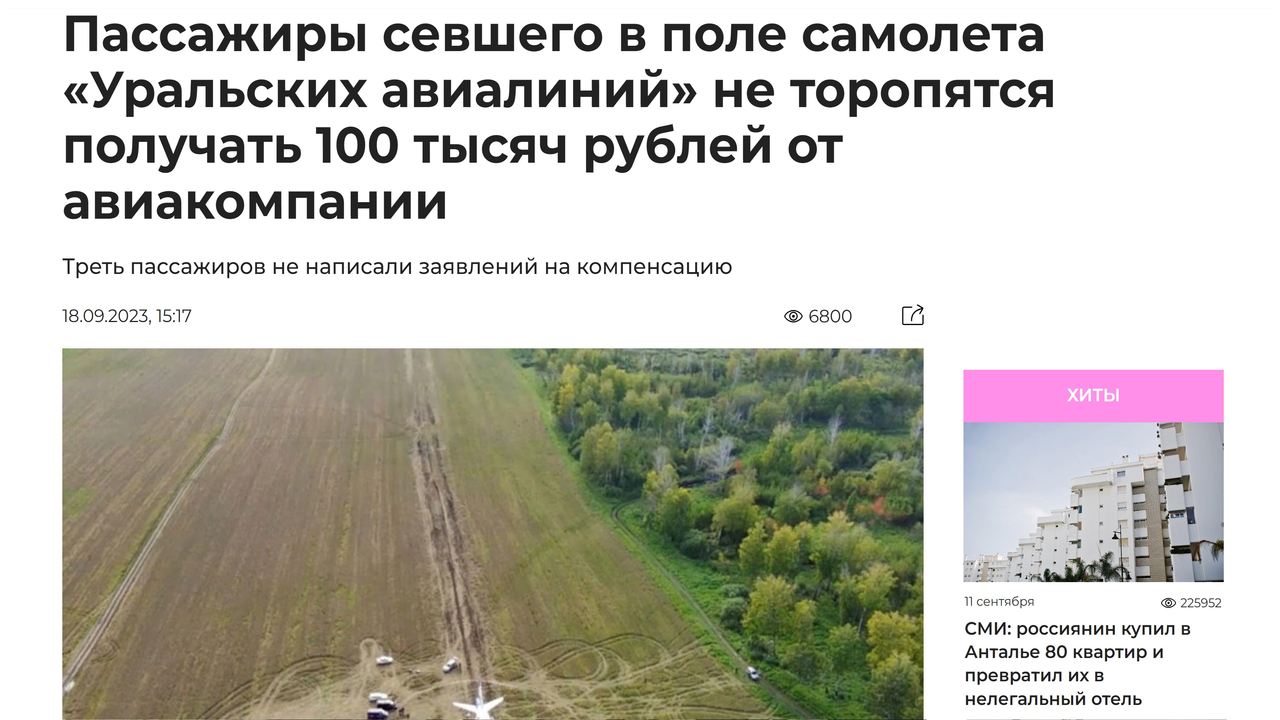 Новости туризма 18/09/2023 Пассажиры «Уральских авиалиний» не торопятся получать 100 тысяч #туризм"