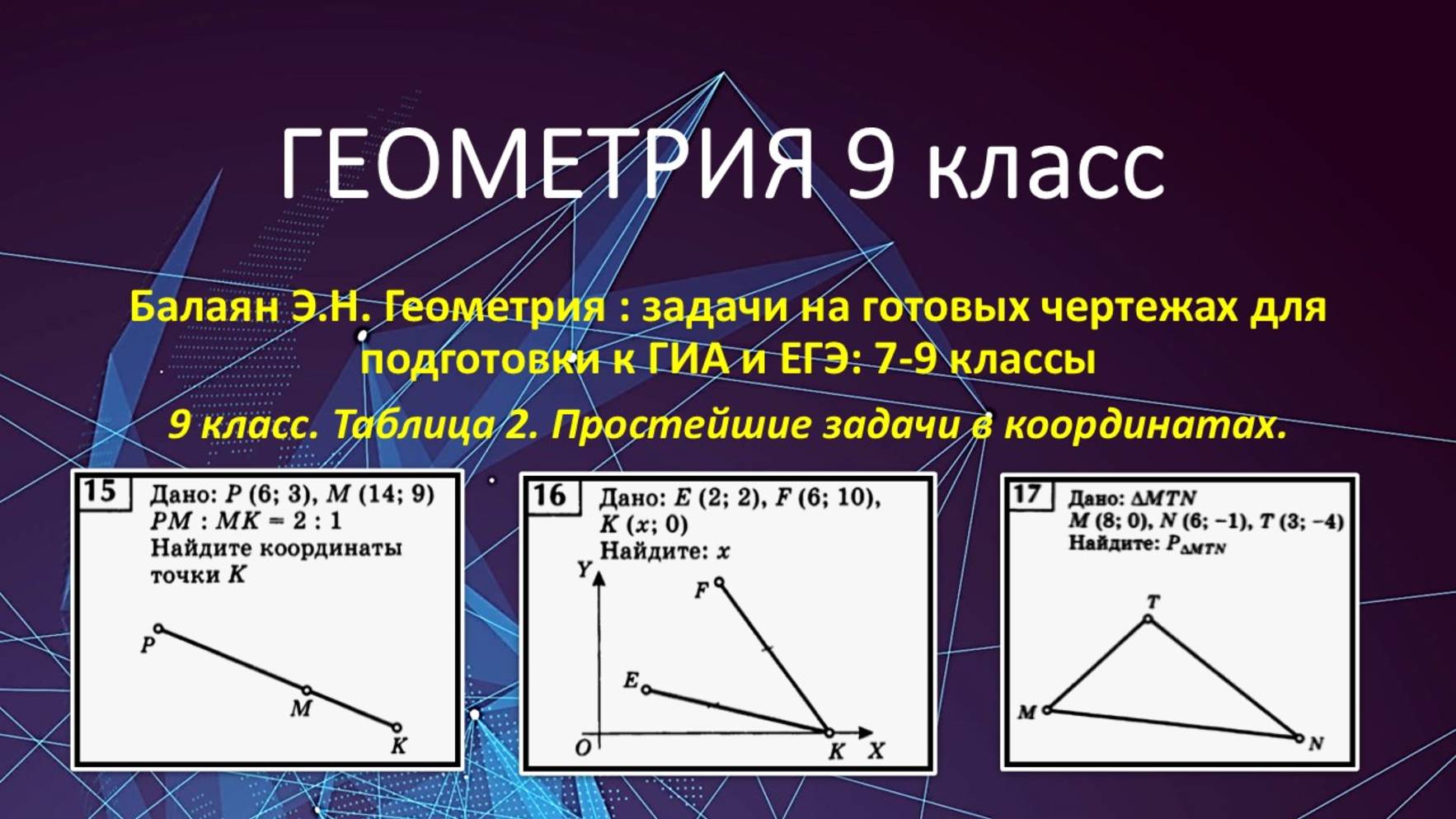 https://dzen.ru/profile/editor/irinaklok https://vkvideo.ru/@club228129393 Геометрия 9 класс по учебнику Атанасяна. В этом видео решаем задачи из сборника Балаяна Э.Н. Геометрия : задачи на готовых чертежах для подготовки к ГИА и ЕГЭ: 7-9 классы. 9 класс. Таблица 2. Простейшие задачи в координатах. 00:00:00 Задача № 15 00:08:27 Задача № 16 00:14:27 Задача № 17