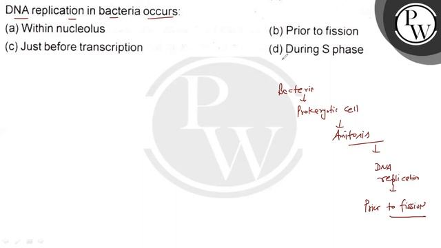 DNA replication in bacteria occurs: (a) Within nucleolus (b) Prior to fission (c) Just before transcription (d) During S phase 📲PW App Link - https://bit.ly/YTAI_PWAP 🌐PW Website - https://www.pw.live