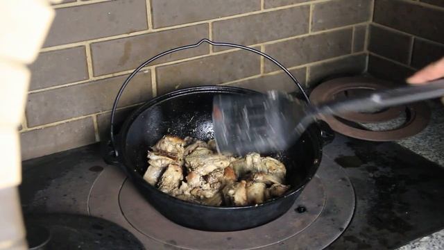 Утка с квашенной капустой и рисом в казане на костре.