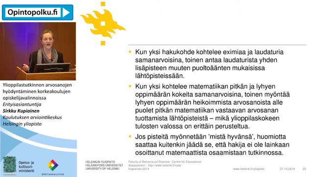Valintojen kehittämisnäkymiä * Ylioppilastutkinnon arvosanojen hyödyntäminen korkeakoulujen opiskelijavalinnoissa Erityisasiantuntija Sirkku Kupiainen, Koulutuksen arviointikeskus, Helsingin yliopisto