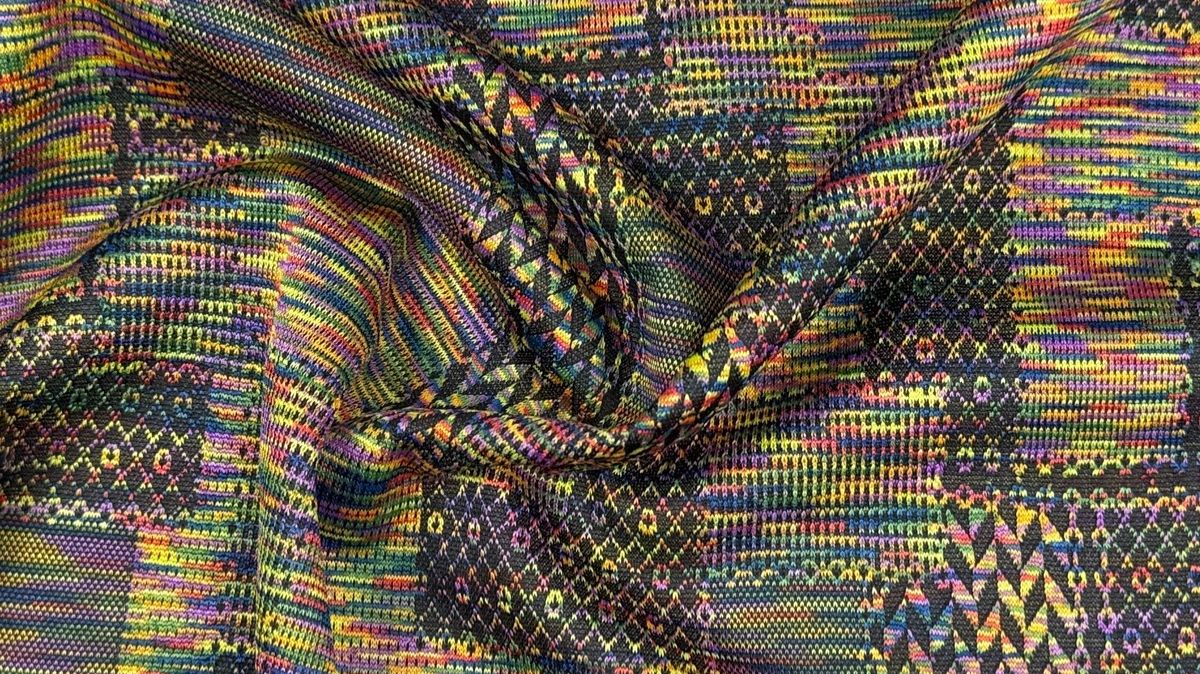 Ткань джерси переливы. Плотный (450 гр), но эластичный материал. Лицевая сторона цветная с геометрическим орнаментом, изнанка гладкая однотонная. Практически не мнется. Не дает усадку. Закладывается в мягкие подвижные складки. Приятен к телу, можно шить без подкладки. Что шить: платья, жакеты, юбки. Уход за тканью: - бережная машинная или ручная стирка при температуре 30 градусов; - отжим на минимальных оборотах; - сушить в расправленном виде; - утюжка на минимальном температурном режиме; - не отбеливать.