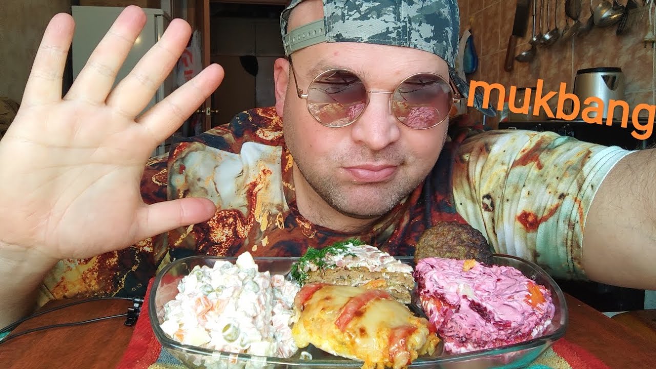 МУКБАНГ Оливье и Под шубой,печеночный пирог и филе курицы/ОБЖОР обеденный