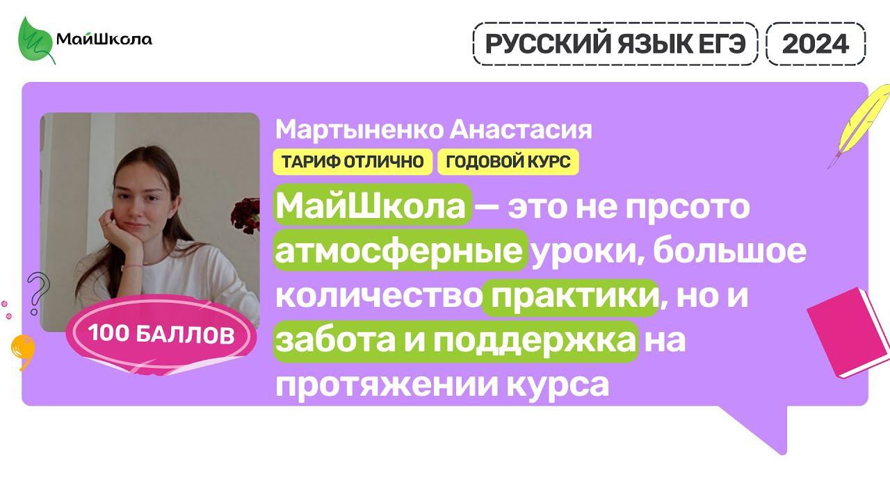 Мартыненко Анастасия. 100 баллов ЕГЭ 2024 | МайШкола #егэ #русскийязык Записывайся на актуальные курсы подготовки к ЕГЭ по Русскому языку здесь: https://clck.ru/359pZC МайШкола это: - Опытные преподаватели, которые в совершенстве знают структуру ЕГЭ и каждый год сдают ЕГЭ по своему предмету, чтобы почувствовать себя на месте ученика - У нас авторская программа подготовки, показавшая свою эффективность на результатах ЕГЭ более 3000 учеников - 88 – средний балл учеников на ЕГЭ по Русскому языку Подписывайся на канал, чтобы не пропустить новые видео и эфиры! https://www.youtube.com/channel/UC6QrLx01kmc7kLt4fnl_s6Q ► Инстаграм: https://www.instagram.com/rus_sofi ► Телеграм-канал: https://t.me/rus_sofi ► Группа ВК: https://vk.com/public184420530