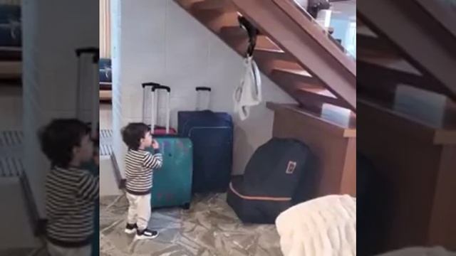 Кошка играет с сыном