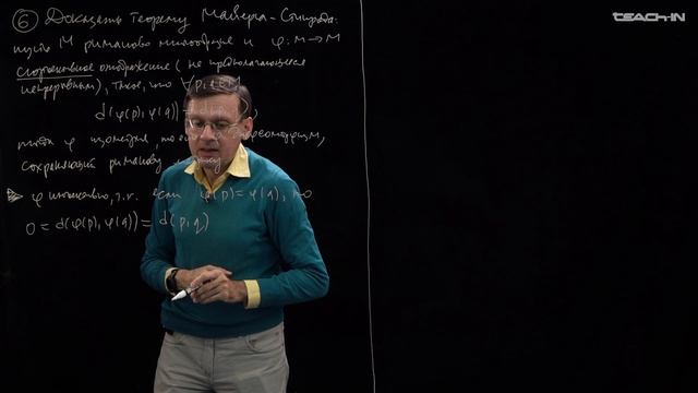 Римановы накрытия. Теорема Адамара-Картана Пенской Алексей Викторович 00:16 Задача 1 (доказать, что отображение плоскости в цилиндр - риманово накрытие) 05:22 Задача 2 (пример неполного многообразия и локальной изометрии, которое не является римановым накрытием) 10:18 Задача 3 (доказать теорему Адамара-Картана) 18:09 Задача 4 (разобрать теорему Адамара-Картана на примере цилиндра) 24:43 Задача 5 (разобрать теорему Адамара-Картана на примере тора с плоской метрикой) 30:04 Задача 6 (доказать теорему Майерса-Стинрода) Ссылка на плейлист Teach-In: https://teach-in.ru/course/riemannian-geometry-seminars-p2 Ссылка на плейлист YouTube: https://www.youtube.com/playlist?list=PLcsjsqLLSfNAksR02L2dufdGAQXXEV5De Ссылка на плейлист VK: https://vkvideo.ru/playlist/-176441665_818 Ссылка на плейлист RuTube: https://rutube.ru/plst/1202146 #teach_in #мгу #msu #мехмат #mechanics_and_mathematics #семинары #exercise_class #Пенской #Penskoy #риманова_геометрия #riemannian_geometry #риманово_накрытие #riemannian_covering #теорема_Адамара_Картана #Hadamard_Cartan_theorem #теорема_Майерса_Стинрода #Myers_Steenrod_theorem