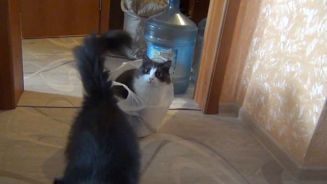 Кошка в пакете держит оборону / Кошка носит пакет на себе как улитка панцирь