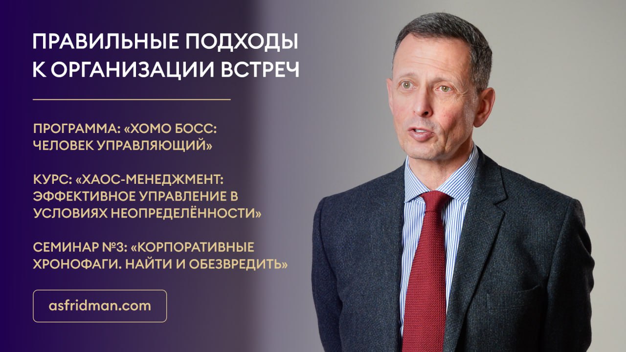 Правильные подходы к организации встреч Программа: «Хомо Босс: Человек Управляющий» Курс: «Хаос-Менеджмент: Эффективное управление в условиях неопределённости» Семинар №3: «Корпоративные хронофаги. Найти и обезвредить» Расписание открытых семинаров Александра Фридмана: https://www.asfridman.com/raspisanie/