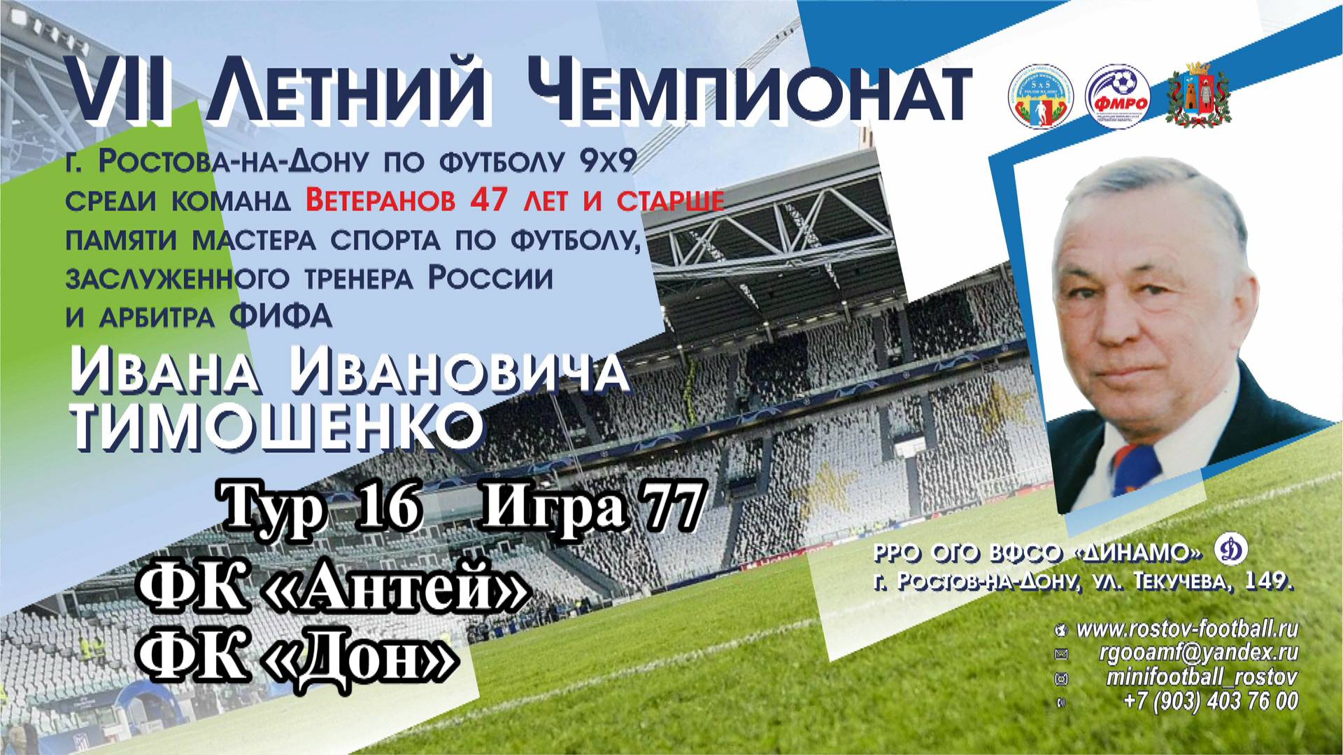 VII Летний Чемпионат г. Ростова-на-Дону по футболу 9х9 памяти мастера спорта по футболу, заслуженного тренера России и арбитра ФИФА ТИМОШЕНКО ИВАНА ИВАНОВИЧА среди команд ветеранов 47 лет и старше. Участвующие команды: 1. ФК РЦ «МАЗ ЮГ» г. Ростов-на-Дону (руководитель Садовниченко Олег, тренер Самогов Аслан) 2. ФК «Салют» г. Ростов-на-Дону (руководитель Фейзуллаев Гумбат, главный тренер Дубровский Денис, администратор Шелегия Олег) 3. ФК «Роствертол» г. Ростов-на-Дону (тренер Цесарский Михаил, старший менеджер Кудрявцев Дмитрий) 4. ФК «Симург» г. Ростов-на-Дону (руководитель Мусакаев Камал, тренер Лысых Георгий) 5. ФК «Динамо» г. Ростов-на-Дону (руководитель Левшин Александр) 6. ФК «Старт» г. Ростов-на-Дону (руководитель Батюшин Владимир, тренер Колесниченко Максим) 7. ФК «Антей» г. Ростов-на-Дону (руководитель Макарьев Антон) 8. ФК «Александровка» г. Ростов-на-Дону (директор Ткаченко Юрий, начальник команды Чупрун Владимир) 9. ФК «СУ СКВО» г. Ростов-на-Дону (руководитель Зима Денис, капитан команды Корягин Игорь) 10. ФК «АВЕРС» г. Ростов-на-Дону (руководитель Кулёв Дмитрий, тренер Резников Юрий, администратор Андреев Андрей) 11. ФК «Дон» г. Семикаракорск, Ростовская область (руководитель Процевский Виктор, тренер Разбура Андрей). Место проведения: РРО ОГО ВФСО «ДИНАМО» по адресу: г. Ростов-на-Дону, ул. Текучева, 149. Проводящие организации: Ростовская городская общественная организация «Ассоциация мини-футбола» (РГОО «АМФ»), Региональная общественная организация «Федерация микрофутзала Ростовской области» (РОО «ФМРО»). Главный судья соревнований, Александр Малявин www.rostov-football.ru rgooamf@yandex.ru
