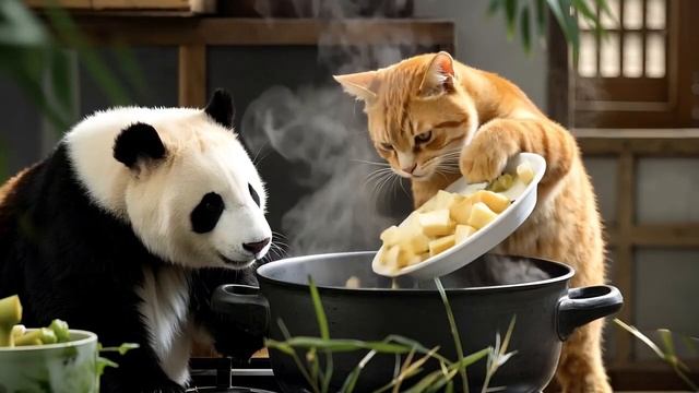 The kitten saved the giant panda and took it home to cook bamboo shoots for the
