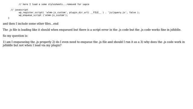 Wordpress: Problem getting .js file to load via a plugin Helpful? Please support me on Patreon: https://www.patreon.com/roelvandepaar With thanks & praise to God, and with thanks to the many people who have made this project possible! | Content (except music & images) licensed under CC BY-SA https://meta.stackexchange.com/help/licensing | Music: https://www.bensound.com/licensing | Images: https://stocksnap.io/license & others | With thanks to user Milo (wordpress.stackexchange.com/users/4771), user Jason (wordpress.stackexchange.com/users/16641), and the Stack Exchange Network (wordpress.stackexchange.com/questions/76151). Trademarks are property of their respective owners. Disclaimer: All information is provided "AS IS" without warranty of any kind. You are responsible for your own actions. Please contact me if anything is amiss at Roel D.OT VandePaar A.T gmail.com