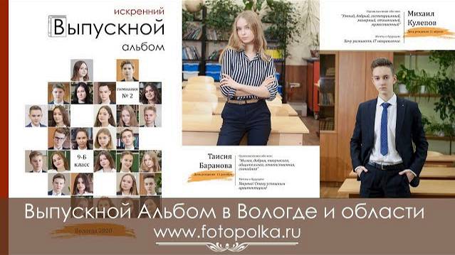 Выпускной альбом в Вологде для 9 класса Выпускная фотокнига 'Классика' | гимназия 2 9 Б класс | выпуск 2020 ✔ ОФОРМИТЕ ПРЕДВАРИТЕЛЬНУЮ ЗАЯВКУ и пригласите фотографа на собрание (цены осенью на 10% выгоднее, чем после нового года) https://vk.com/vipusknik35?w=app5708398_-100472353 ✔ 6-ти цветная полиграфическая фотопечать дает четкую проработку деталей. ✔ Удобный формат 20*30 см. ✔ Индивидуальная страница для каждого выпускника. ✔ Практичная глянцевая ламинированная фотообложка. ✔ Проверенный временем прочный переплет. 📷 Подробнее о продукте https://vk.com/market-100472353?section=album_2 https://fotopolka.ru/vypusknoy-albom-9-11-klass Приедем, покажем, разыграем бесплатную фотосессию среди выпускников. звоните ☎️ 89115000505 Viber/WhatsApp, (8172)78-45-05 Вадим Есин Теги: yt:quality=high,Вологда,Вадим Есин,выпускной альбом,выпускная фотокнига,выпускные фотокниги,фотограф на выпускной,фотограф школа,выпускной альбом 9 класс,выпускной альбом 11 класc,школьный фотограф,школьный альбом,выпускной альбом череповец,выпускная папка