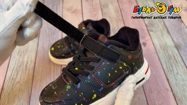 336422 Кроссовки Pasito утепленные на шнуровке и липучке с яркими пятнами черные