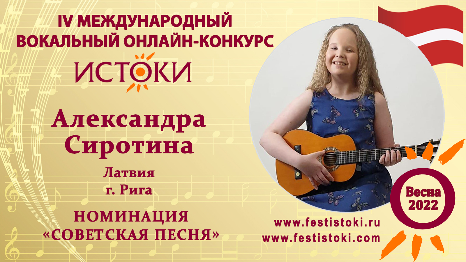 Лауреат III степени IV Международного вокального онлайн-конкурса «Истоки».Весна-2022. Номинация "Советская песня". Песня "Ветер перемен". Авторы Максим Дунаевский, Наум Олев. Сайт: www.festistoki.ru / www.festistoki.com E-mail: festistoki@mail.ru