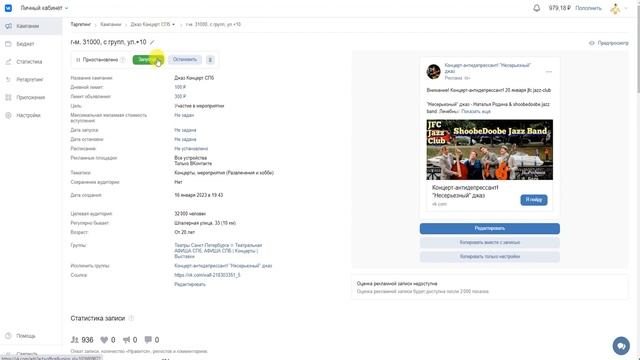 Маркет платформа вКонтакте и Кейс настройка рекламы на концерт 2023 с бюджетом 500₽.