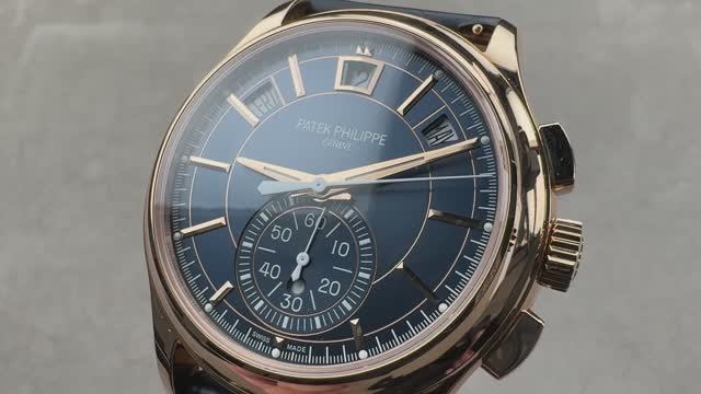 *перевести видео можно в Яндекс браузере Механические часы Patek Philippe Complications Flyback Chronograph Annual Calendar (5905R-010) с годовым календарем и автоподзаводом, 42-миллиметровым корпусом из розового золота 18 карат, обрамляющим циферблат цвета солнечных лучей, на блестящем темно-синем ремешке из кожи аллигатора с пряжкой из розового золота 18 карат. Функции включают в себя отображение часов, минут, дня недели, даты, месяца, хронографа с обратным ходом, индикатора смены дня и ночи, 60-минутного счетчика и годового календаря. Толщина этих часов Patek Philippe составляет 14,2 мм, а длина ремешка - 49,7 мм. Для получения более подробной информации ознакомьтесь с полным обзором годового календаря хронографа Patek Philippe Complications Flyback.