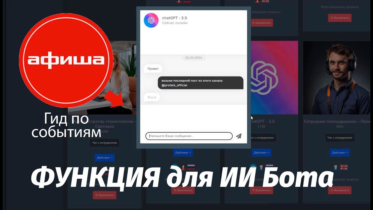 В этом видео рассказывается о функции, которая называется "Афиша: гид по событиям". Эта функция позволяет получать информацию о событиях с сайта афиши. Мы можем добавить возможность боту узнавать о том, что происходит в различных событиях в городе. Давайте продемонстрируем, как это работает, перейдя к нашему боту. У меня уже есть готовый пустой бот без настроек. Я просто добавлю эту функцию, которую можно найти под названием "Афиша". Ничего больше не меняю, просто добавляю функцию. Давайте попросим найти концерты в Солнечногорске на этой неделе. Бот выдаст результаты о предстоящих событиях. Давайте также спросим, какие фильмы идут сегодня в кинотеатрах Воронежа. Бот покажет нам список фильмов на сегодня. Эта функция легко устанавливается и не требует дополнительных настроек. Вы можете создавать различные боты с уникальными функциями, например, добавить функцию поиска событий в афише или поиска мест по геолокации. Экспериментируйте и пробуйте разные возможности. В этом видео я показал и рассказал о работе функции "Афиша: гид по событиям".