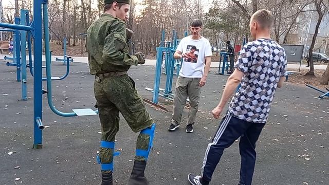 Одной ногой два удара. Блок ногой и удар.