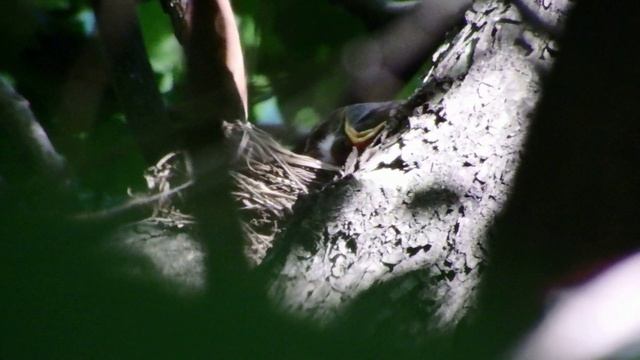 Дрозд рябинник кормит птенцов в гнезде