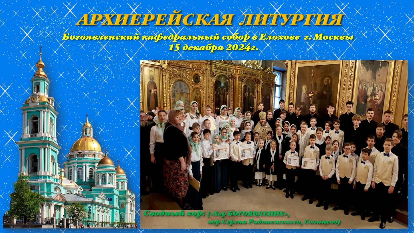 15 декабря 2024 г. в Богоявленском кафедральном соборе в Елохове г. Москвы была совершена АРХИЕРЕЙСКАЯ ЛИТУРГИЯ, в которой принял участие сводный хор (хор "БОГОЯВЛЕНИЕ" и хор Церковной хоровой школы храма Сергия Радонежского в Солнцево) Богослужение возглавил управляющий Западным викариатством архиепископ Одинцовский и Красногорский, настоятель Богоявленского кафедрального собора Фома в сослужении клириков собора.