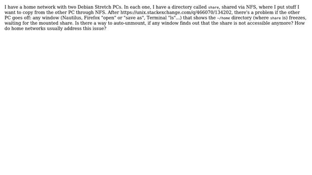 Unix & Linux: Debian NFS auto-unmount if the host PC is turned off Helpful? Please support me on Patreon: https://www.patreon.com/roelvandepaar With thanks & praise to God, and with thanks to the many people who have made this project possible! | Content (except music & images) licensed under CC BY-SA https://meta.stackexchange.com/help/licensing | Music: https://www.bensound.com/licensing | Images: https://stocksnap.io/license & others | With thanks to user sebasth (unix.stackexchange.com/users/239817), user Rodrigo (unix.stackexchange.com/users/134202), and the Stack Exchange Network (unix.stackexchange.com/questions/468518). Trademarks are property of their respective owners. Disclaimer: All information is provided "AS IS" without warranty of any kind. You are responsible for your own actions. Please contact me if anything is amiss at Roel D.OT VandePaar A.T gmail.com