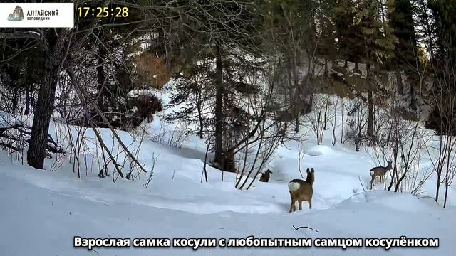 Самка косули с любопытным косуленком в Алтайском заповеднике